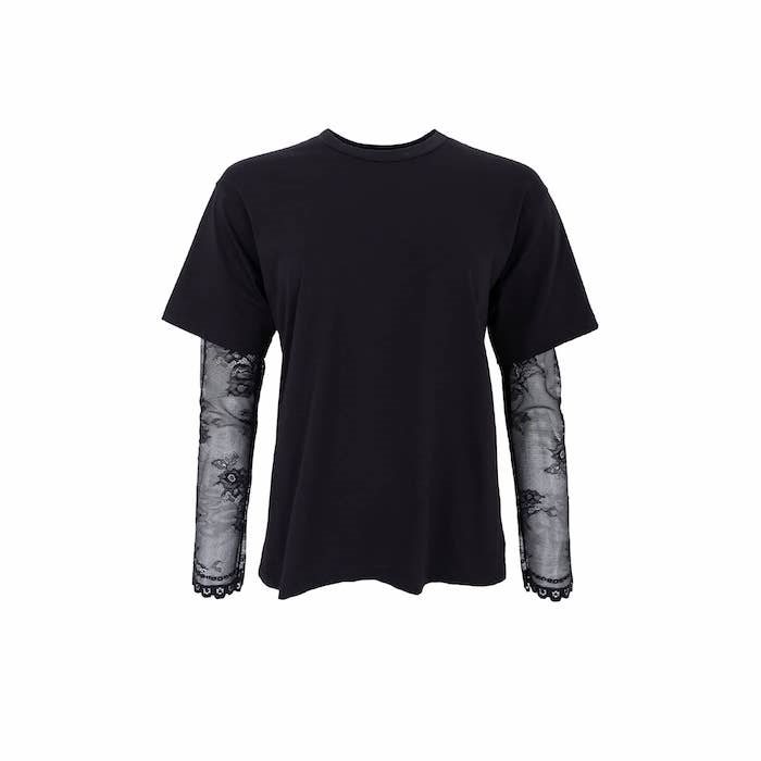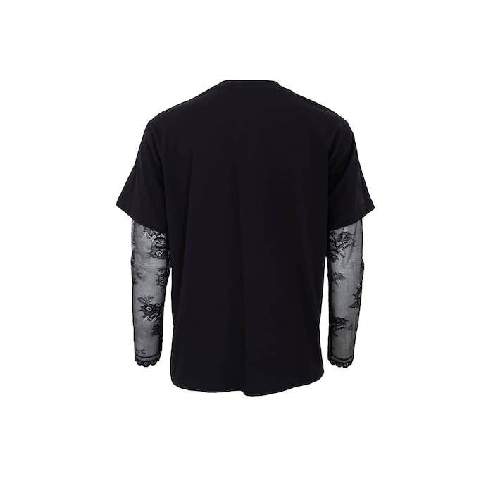 Toppen har lange blondeærmer i en elegant kontrast til den bløde bomuldsjersey, hvilket skaber et moderne og stilrent look, der fungerer perfekt både til hverdag og aftenbrug.