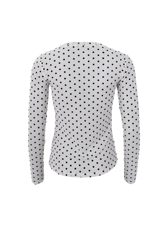 Den hvide farve skaber en frisk og stilren base, mens de markante prikker tilfører kant og personlighed. Materialet består af 95% polyester og 5% spandex, hvilket sikrer en let, strækbar og behagelig pasform, der følger kroppen uden at stramme.