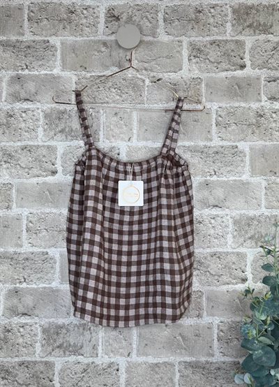 Toppen er lavet i 100% hør, hvilket gør den åndbar og perfekt til varme dage. Det klassiske ternede mønster i brune nuancer giver et naturligt og tidløst look, mens den løse pasform sikrer høj komfort.