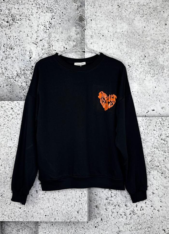 Cool og afslappet sweatshirt fra Cabana Living i en klassisk sort farve med iøjnefaldende 3D-print “Sweeter than Honey” på venstre bryst.