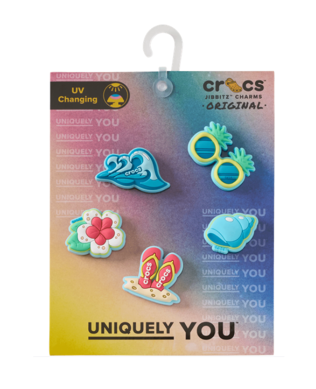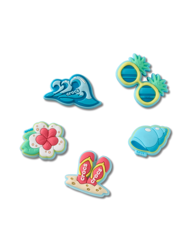 Giv dine Crocs et sjovt og sommerligt twist med denne farverige 5-pak charms. Sættet indeholder legende motiver som bølge, blomst, ananas, flip-flops og musling, der tilsammen skaber et frisk strand- og ferieunivers.