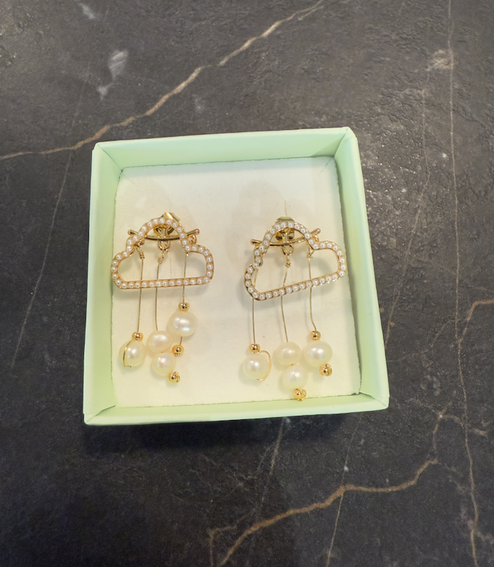 Flotte øreringe med to dele som består af en sky med sten på, og nogle lange kæder med ferskvandsperler på. Øreringene er belagt med 18 karat guld.