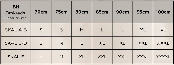 Mål omkreds under barmen for at finde din størrelse. Ligger du mellem to størrelser, anbefales den største for bedst komfort. Alle BH’er har stræk og hægtelukning, der kan justeres med +/- 4 cm.