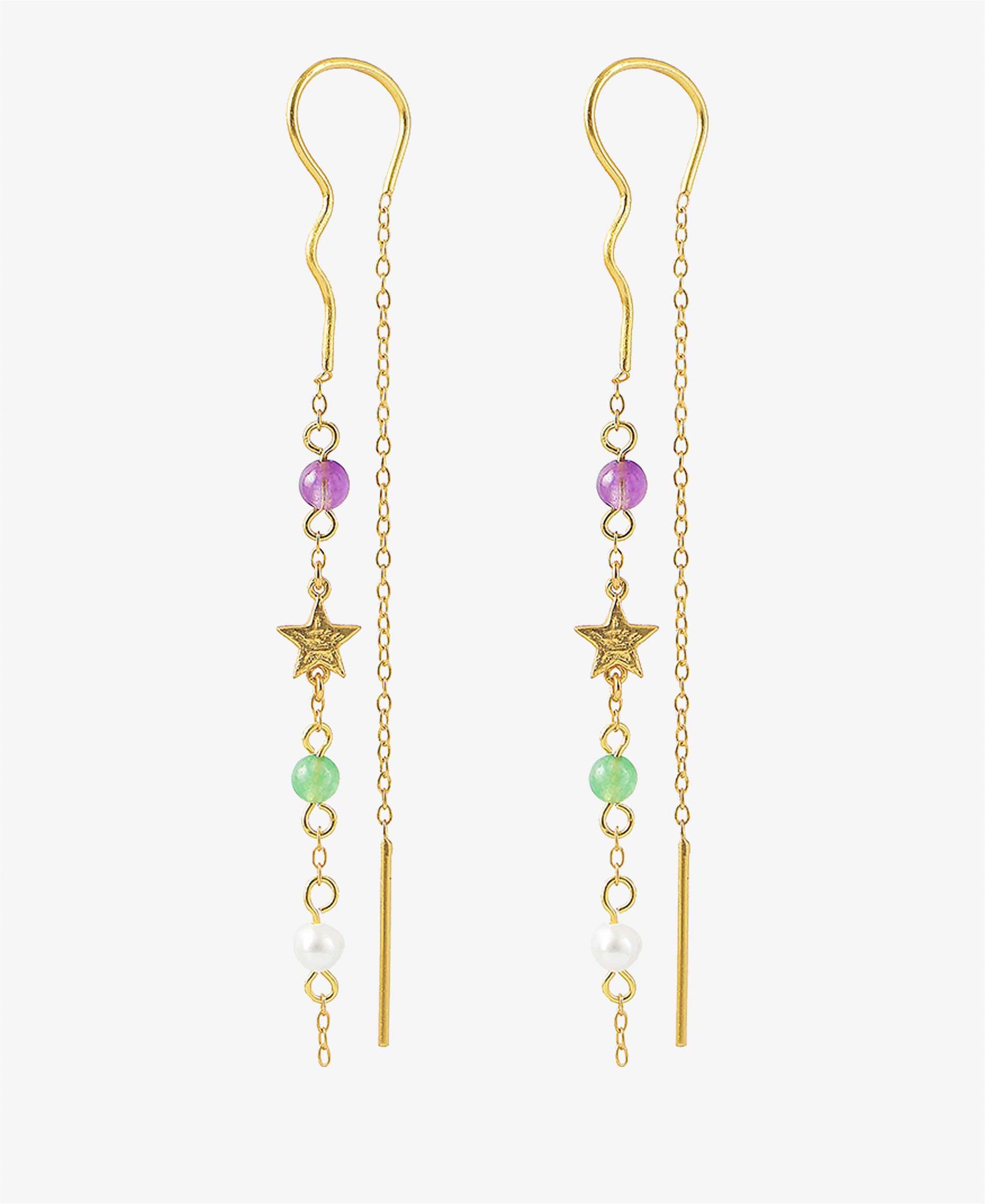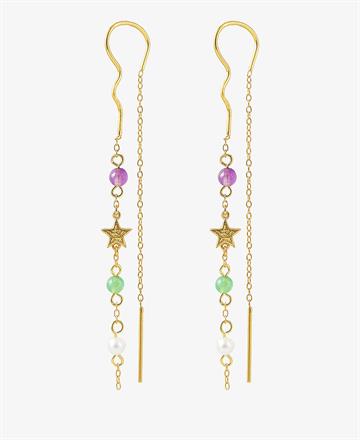 Øreringene er lange og med forskellige farvede perler samt ferskvandsperler på.