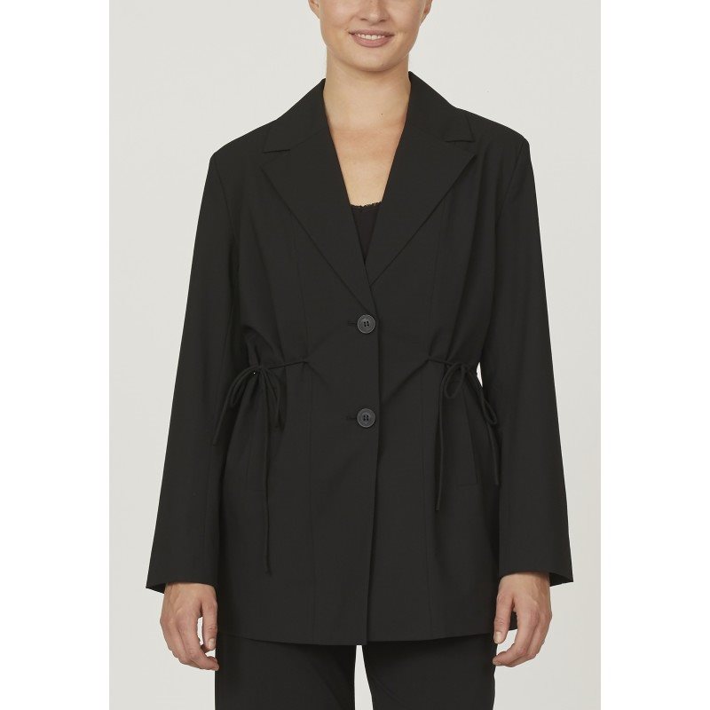 Smuk sort blazerjakke fra Love&Divine. Jakken har et elegant snit og lukkes med to knapper foran. Den har lange ærmer og et flot bindebånd i taljen, som giver en feminin silhuet. Perfekt til både hverdag og festlige lejligheder.