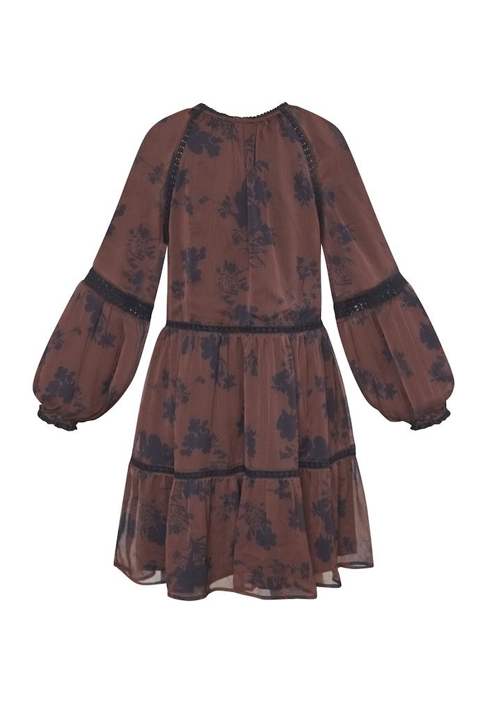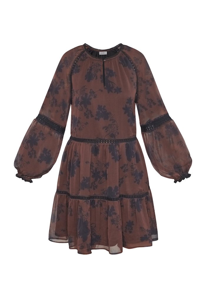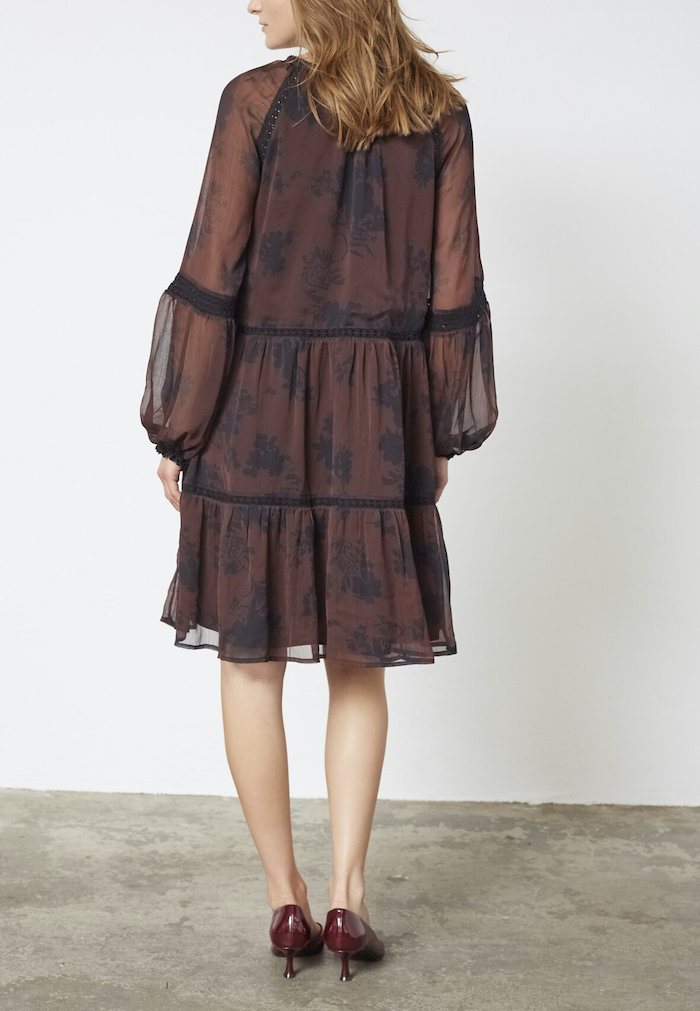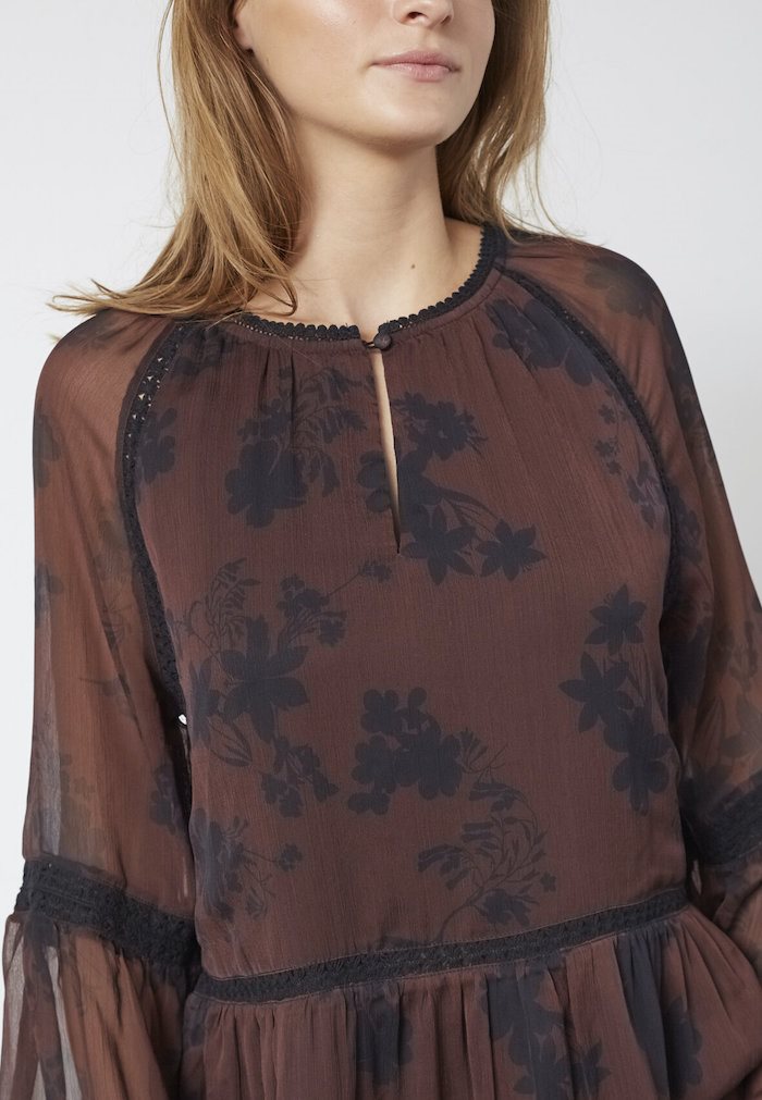 LOVE1406 er en feminin kort kjole med et elegant printet blomstermønster i smukke bordeaux nuancer. Kjolen er designet med en underkjole, som sikrer komfort og dækning, mens de lange, transparente ærmer giver et let og romantisk udtryk.