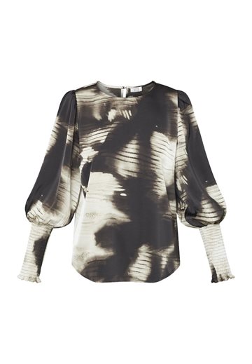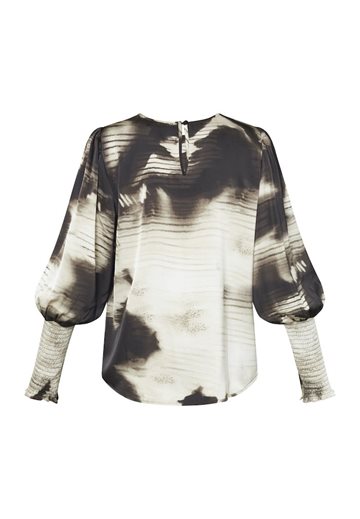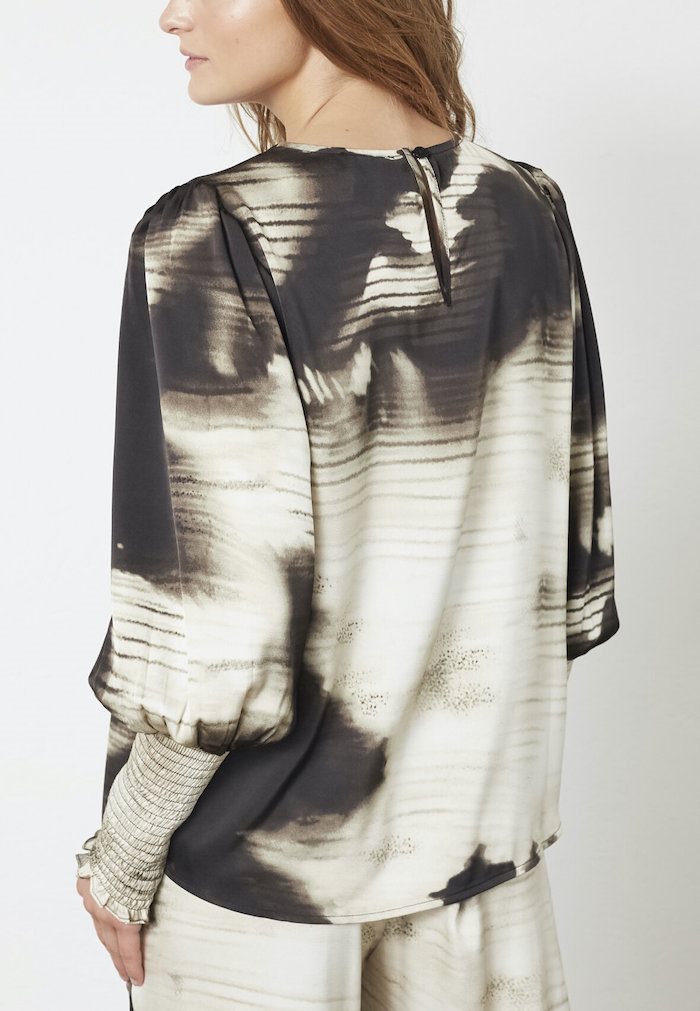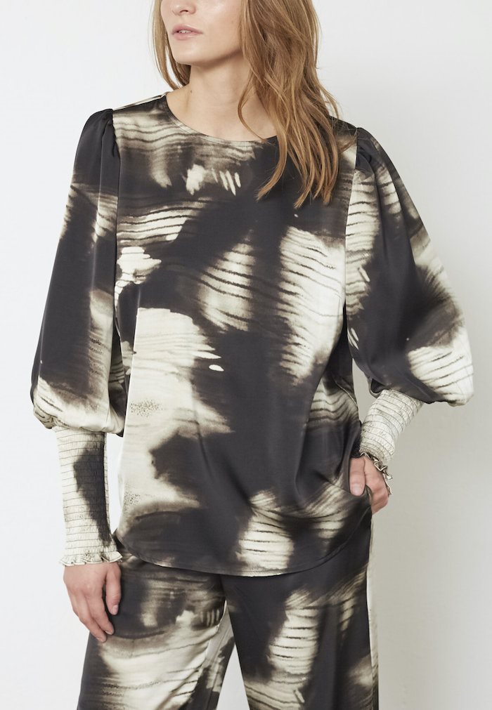LOVE738-24 fra Love & Divine er en smuk bluse med et iøjnefaldende grafisk print. Blusen har lange ærmer med vidde og rynk ved skuldrene, som skaber et feminint og elegant udtryk. De fine smock-detaljer ved håndleddene giver en flot afslutning og gør pasformen behagelig. Perfekt at style med både jeans, nederdele eller de matchende bukser i samme print.