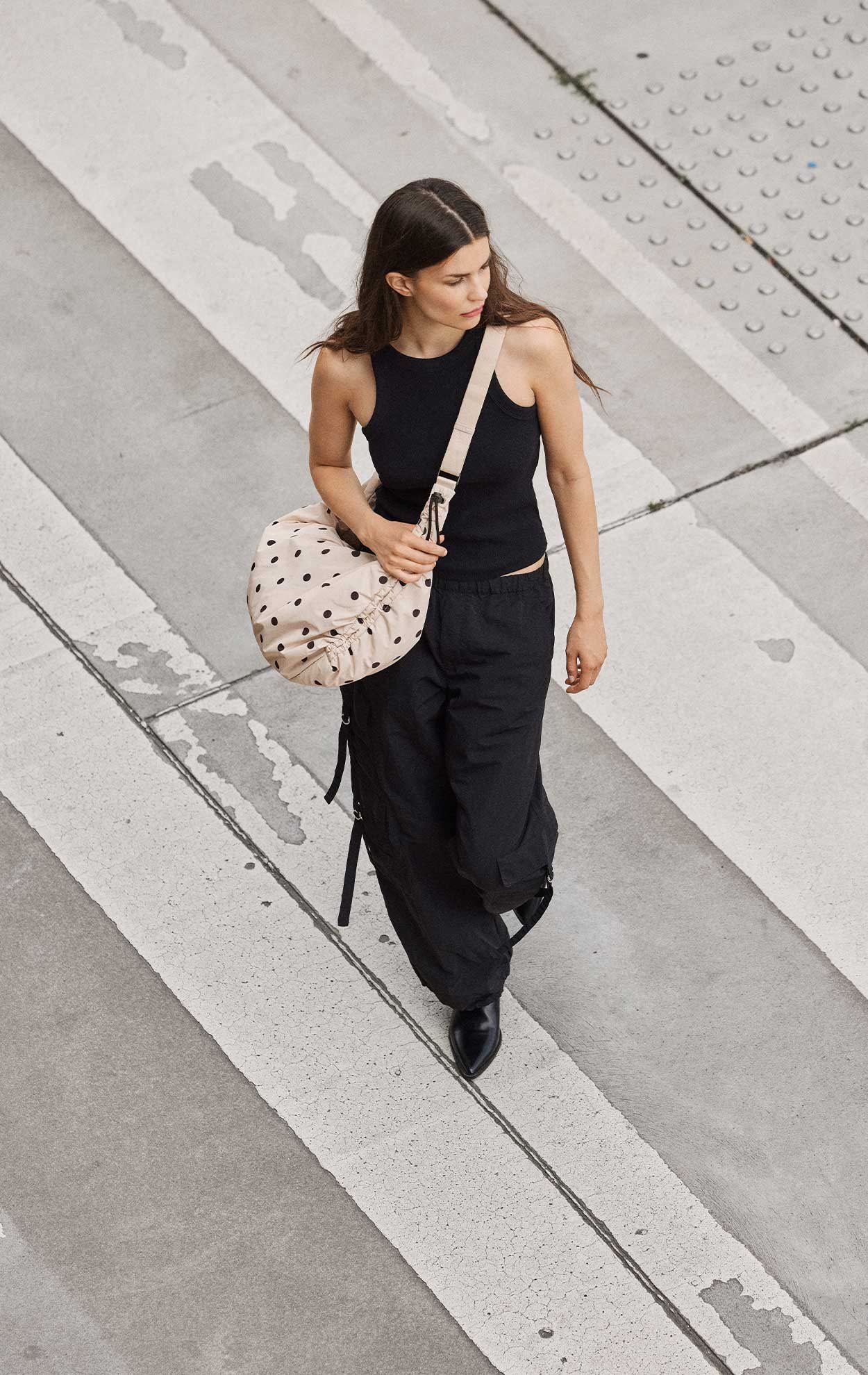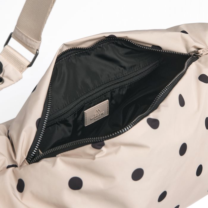 Opgrader dit look med Markberg Alpinembg Bag, en rummelig og stilfuld crossbody taske i creme med sorte polkaprikker.