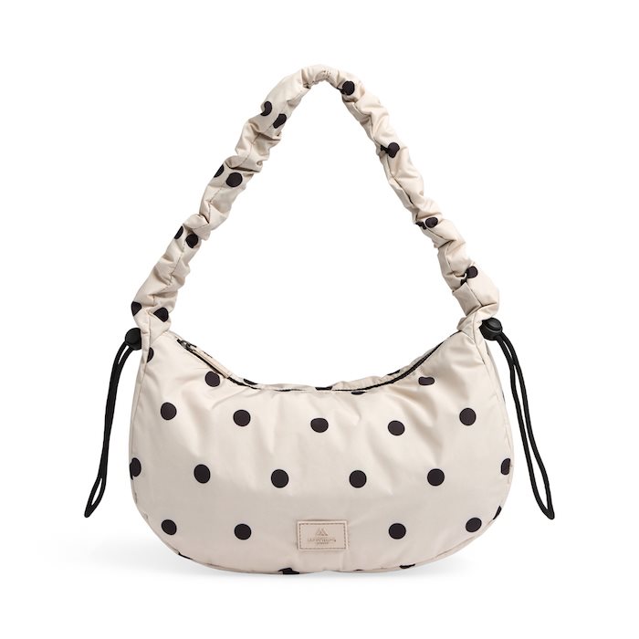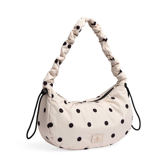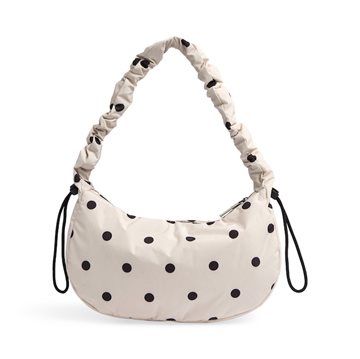 Denne elegante håndtaske i creme med sorte prikker har en flot rynkeeffekt på siderne, som giver et moderne og feminint udtryk.