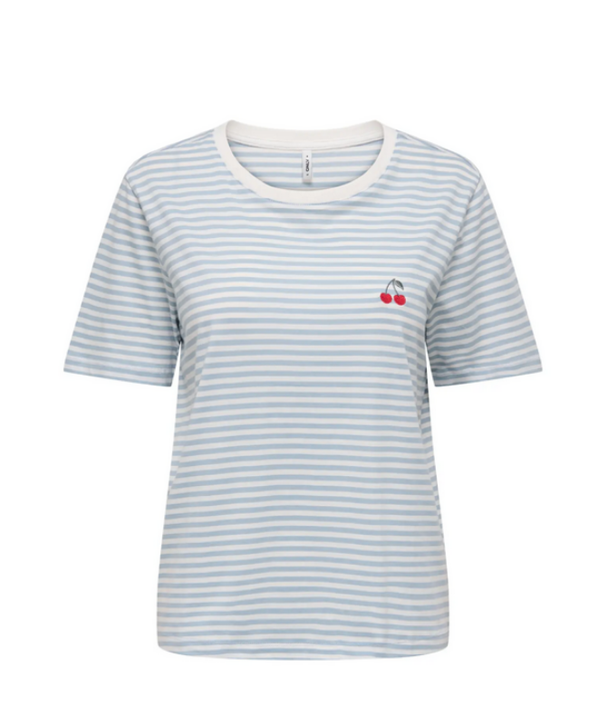 Denne T-shirt fra ONLY har et friskt og klassisk udtryk med smalle striber i cloud dancer hvid og soft chambray blå. Det lille broderede kirsebærmotiv på brystet tilføjer et fint og feminint detail, som giver T-shirten et let og sommerligt look. Den er designet med korte ærmer og rund hals, hvilket gør den behagelig og nem at bruge i hverdagen.