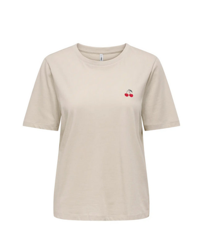 Denne T-shirt fra ONLY har et enkelt og tidløst udtryk i farven Cloud Dancer Oatmeal. Det lille broderede kirsebærmotiv på brystet tilfører et fint og feminint detail, som giver T-shirten et let og sommerligt look. Den er designet med korte ærmer og rund hals, hvilket gør den behagelig og nem at bruge til hverdagsbrug.