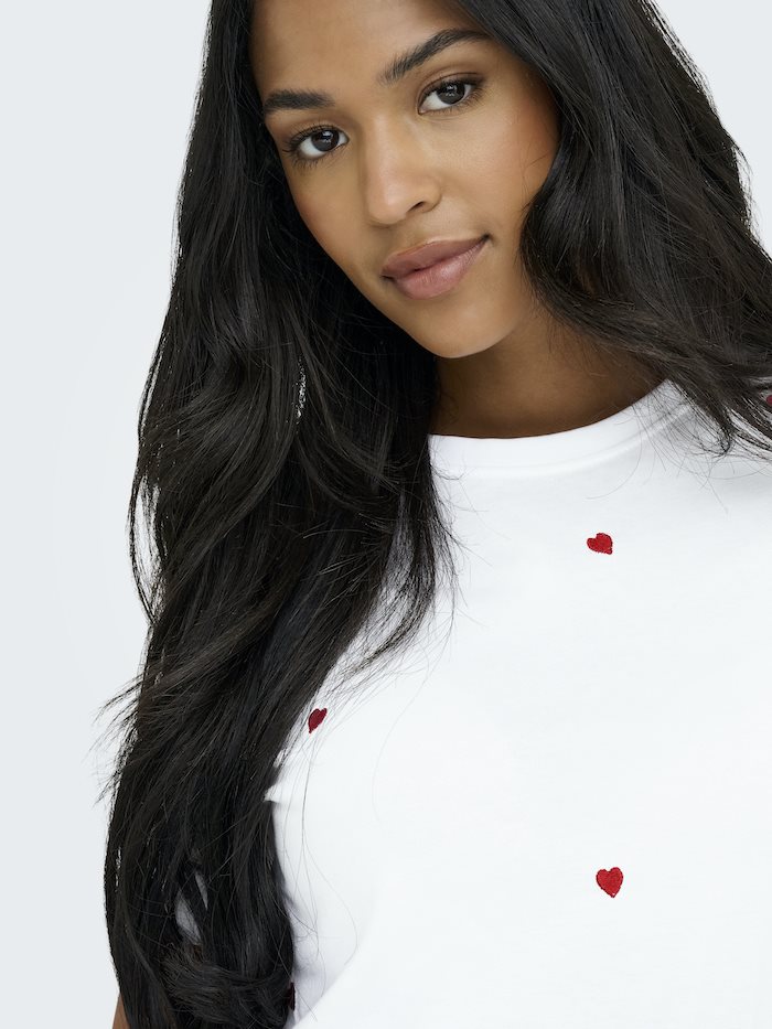 Denne T-shirt fra ONLY kombinerer et klassisk snit med et feminint og tidløst udtryk. KETTY-toppen er udført i en ren, hvid farve og prydet med et diskret print af små hjerter, som giver et elegant og let romantisk look. Den har korte ærmer og rund hals (O-neck), hvilket gør den alsidig og nem at style til både hverdag og mere afslappede anledninger.