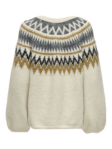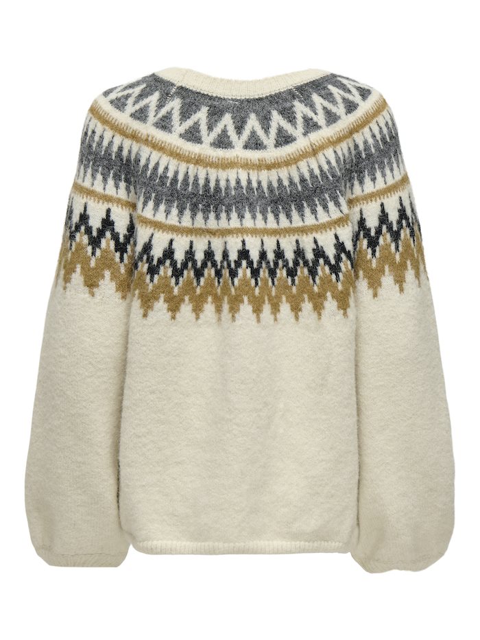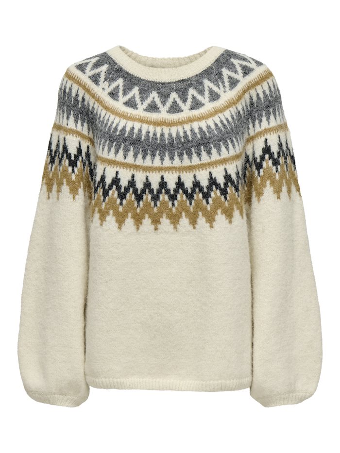 ONLY REYKJA LS O-Neck Knit i farven Whitecap Gray/Dark Grey er en hyggelig og stilfuld strik, der emmer af vinterstemning. Den har et klassisk nordisk mønster i grå og gyldne nuancer, som giver et moderne, men tidløst look. Sweateren har rund hals, lange ærmer og en regular pasform, der gør den perfekt til både hverdagsbrug og afslappede vinterdage.