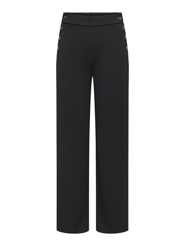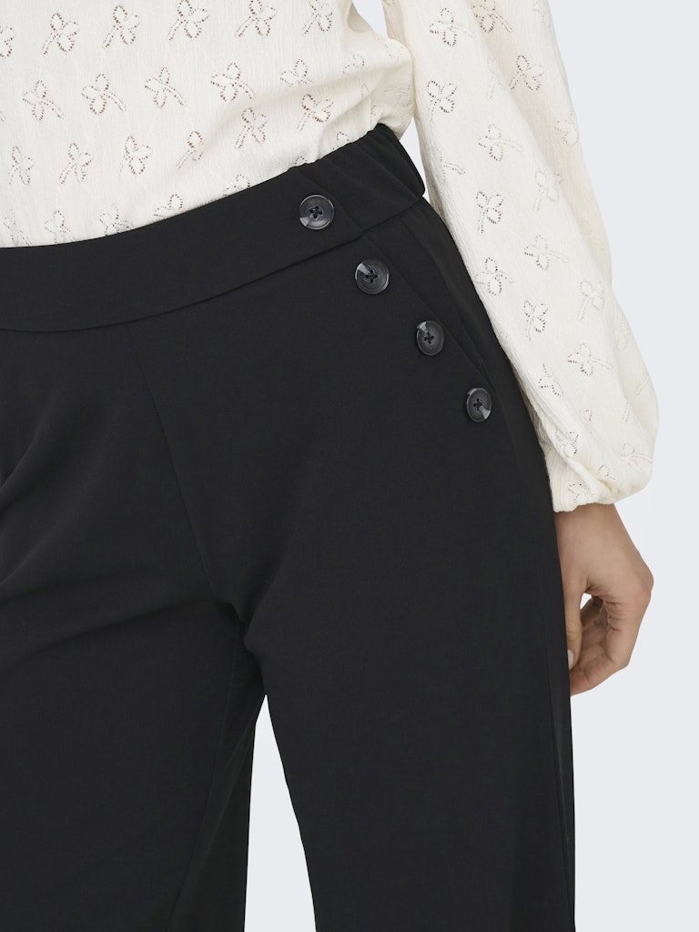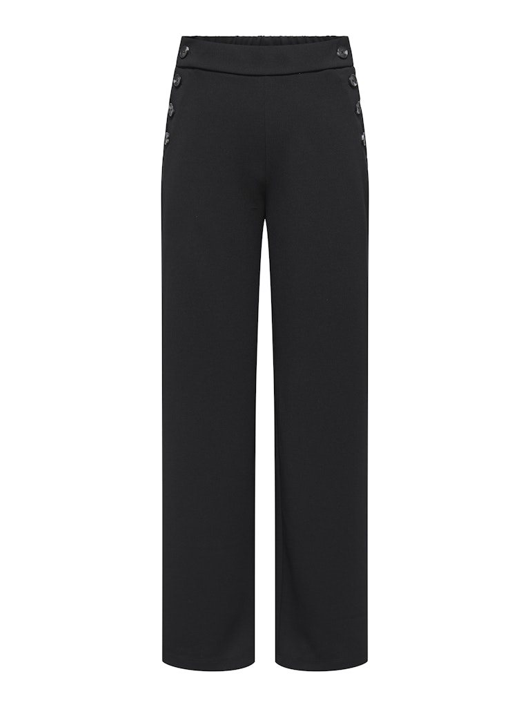 Det elastiske jerseymateriale med stretch sikrer god bevægelsesfrihed og en behagelig følelse hele dagen. De dekorative knapdetaljer tilfører et feminint og moderne udtryk, mens den klassiske sorte farve gør bukserne nemme at style – både med sneakers og skjorte til hverdagsbrug eller med top og hæle til aftenbrug.
