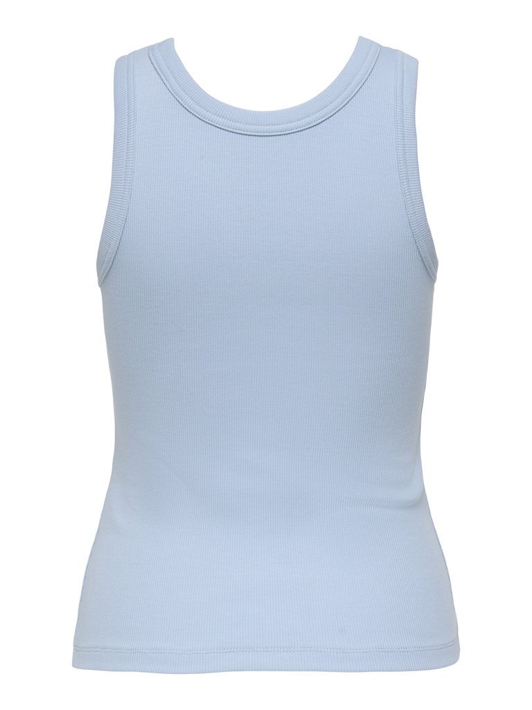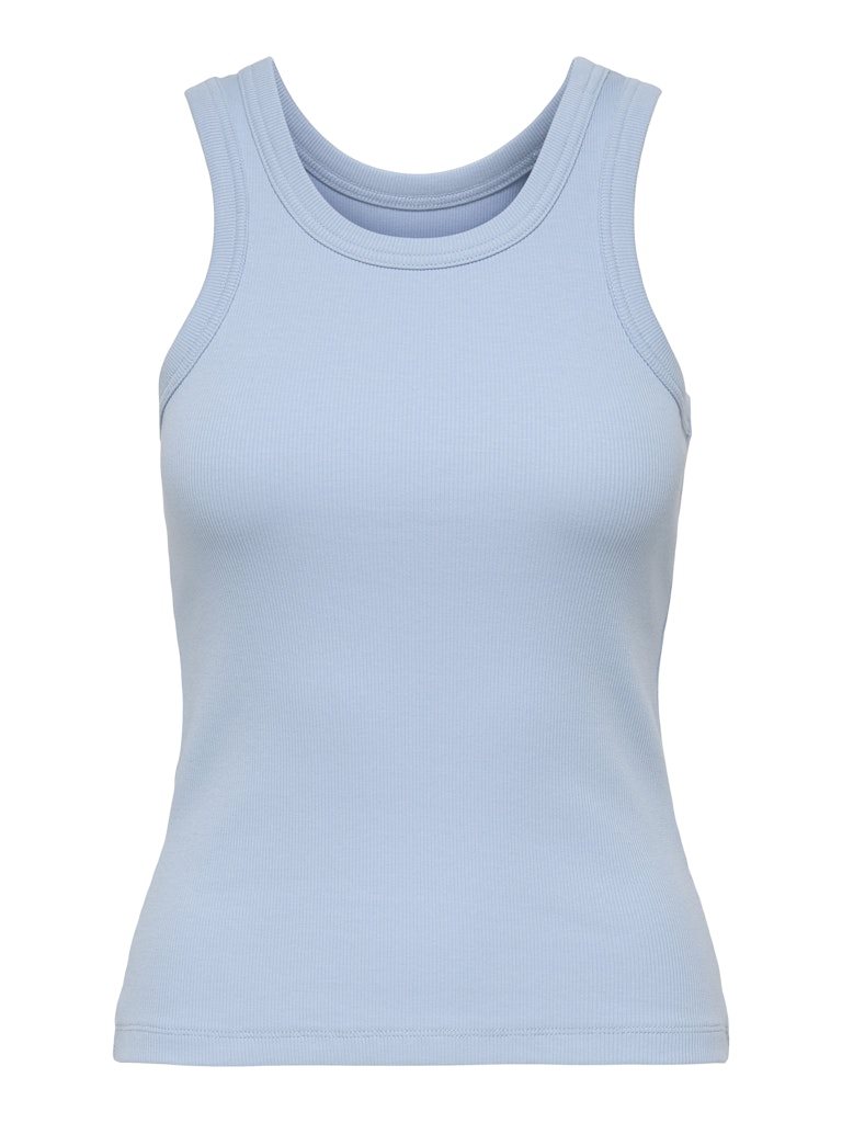 Opgrader din basisgarderobe med ONLY Val 2-Way Tank Top JRS – 15371705 i farven Soft Chambray. Denne lækre rib tanktop er fremstillet i blød, økologisk bomuld med stretch, som sikrer en behagelig og fleksibel pasform hele dagen.