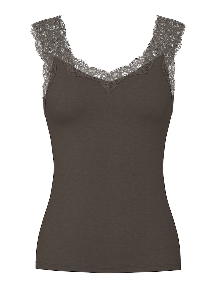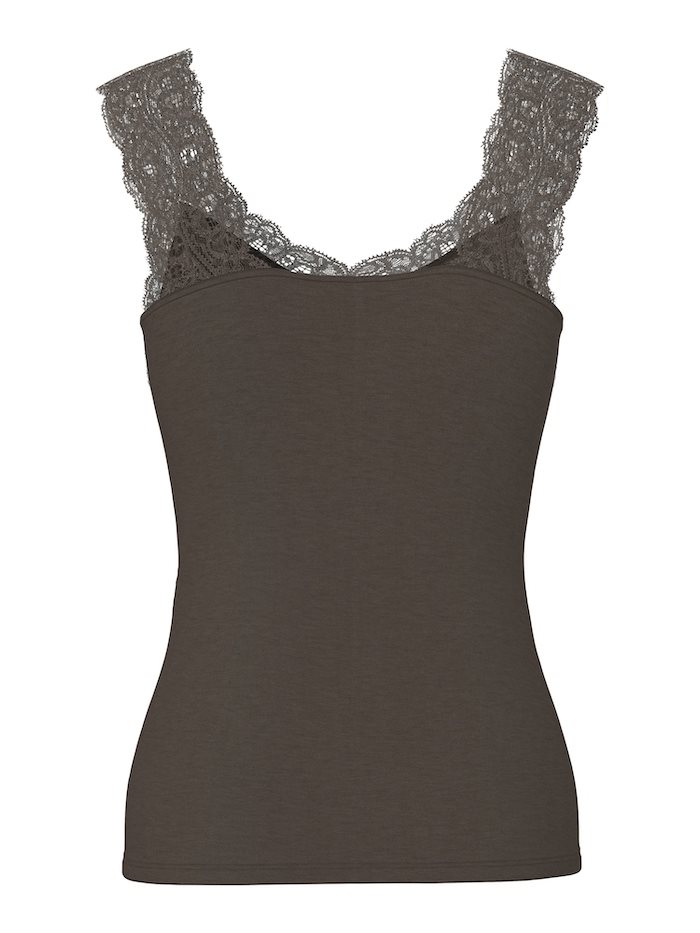 En smuk og alsidig top med fine blondedetaljer ved stropperne og halsen. Toppen er lavet i en lækker kvalitet, der føles skøn mod huden. Perfekt som en elegant undertrøje eller som en feminin top under en cardigan eller blazer.