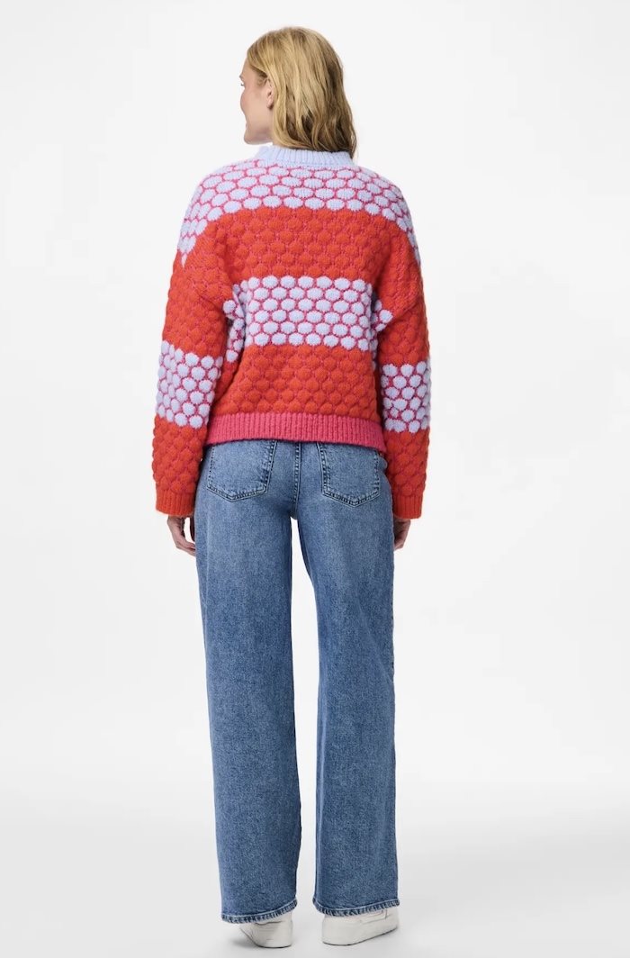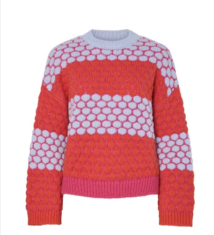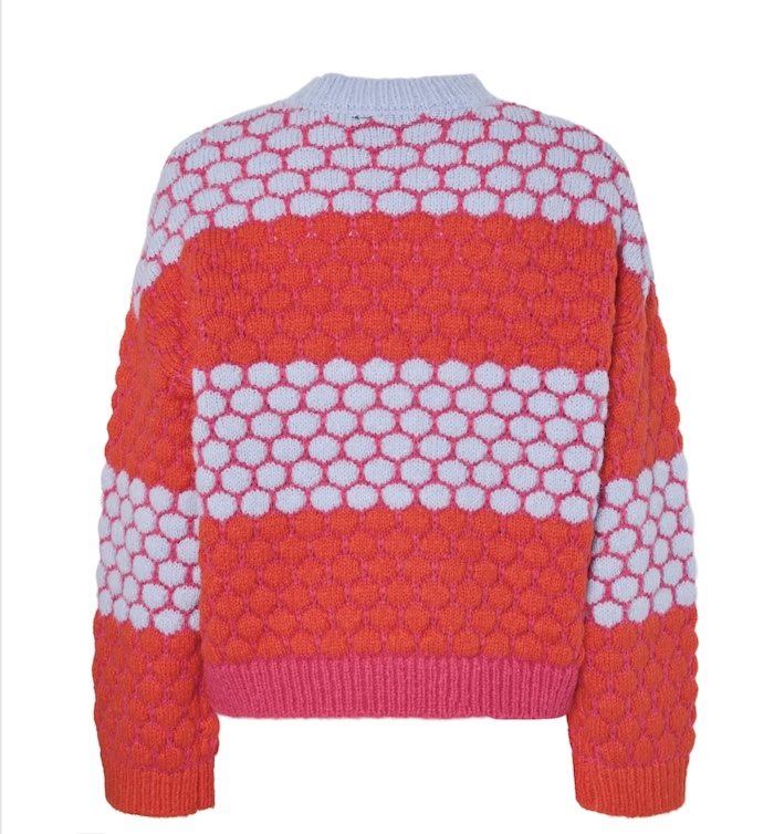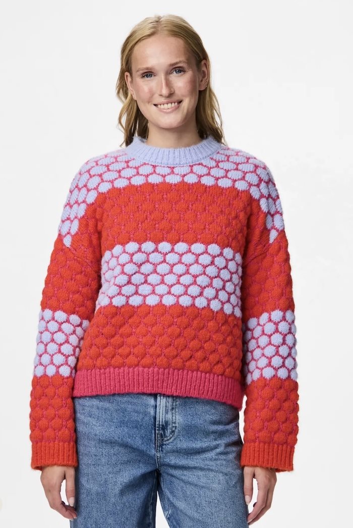 Strikken er fremstillet i en bubble knit-struktur, som skaber et flot 3D-udtryk med let hævede detaljer og giver trøjen ekstra karakter. Den har rund hals, lange ærmer og droppede skuldre, som bidrager til et casual og tidssvarende look. De elastiske manchetter sikrer en behagelig pasform, mens regular fit gør den nem at style til både jeans, nederdele og bukser.