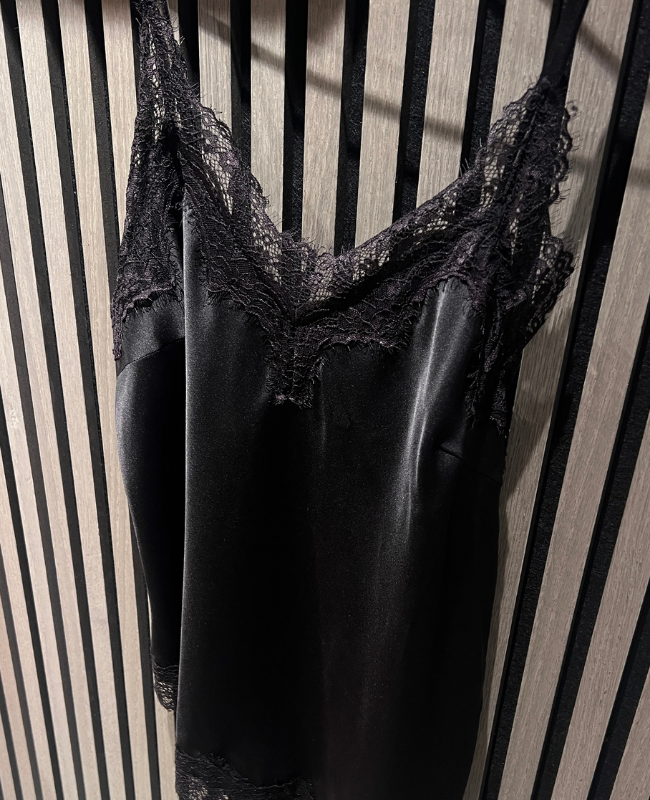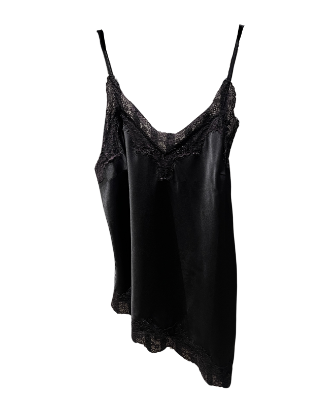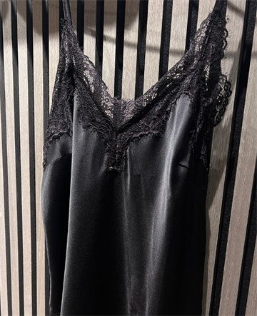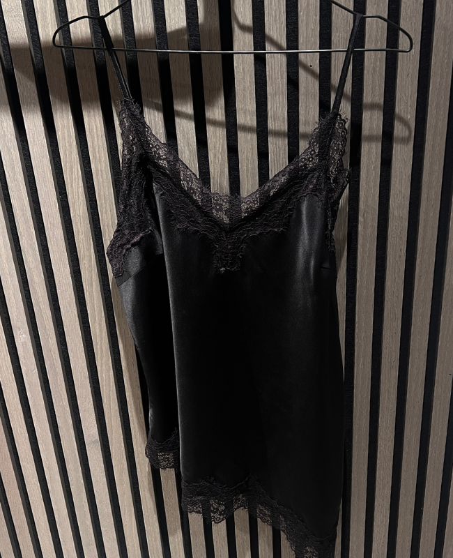 Toppen er designet i en blød, satinlignende kvalitet med en let skrå skæring, der giver et flatterende og eksklusivt udtryk. De delikate blondedetaljer både ved udskæringen og forneden tilfører et romantisk touch, mens de justerbare stropper sikrer en perfekt pasform.