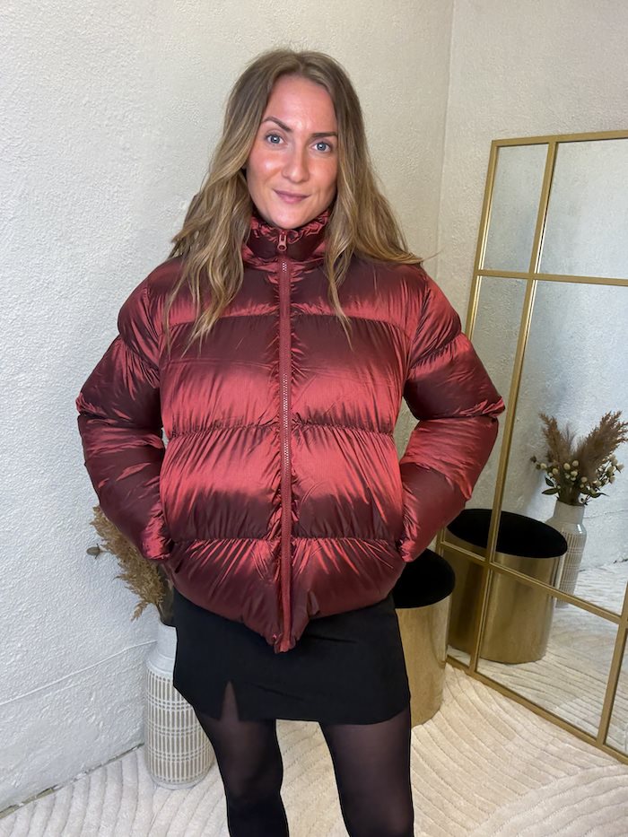Skil dig ud i den kolde sæson med den supercool PIECES Milla Shiny Puffer Jacket i en flot rød Tawny Port-farve.