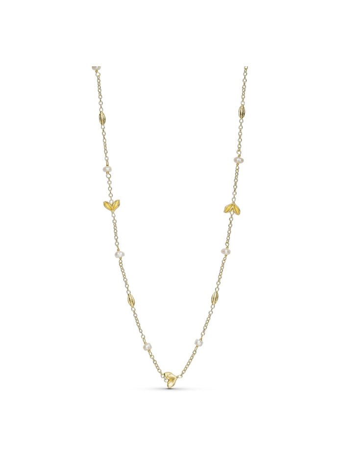 Nadia Necklace fra PURE by NAT er en smuk og feminin halskæde med hvide perler og fine hjertevedhæng, der tilføjer et romantisk touch til ethvert outfit.