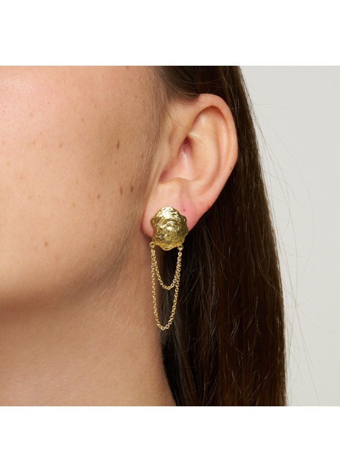 ksklusive og moderne ørestikker med kædedetaljer i guldbelagt finish. ESTHER Chaini Earrings G/B kombinerer et organisk, struktureret frontdesign med fine, bevægelige kæder, der skaber et sofistikeret og iøjnefaldende udtryk.