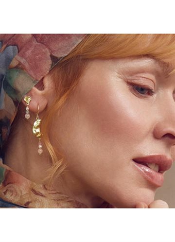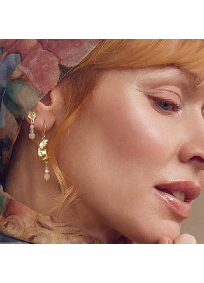 Øreringene er dekoreret med ægte Rose Quartz, Rose Jade og fine ferskvandsperler, som tilsammen skaber et blødt og eksklusivt farvespil i pink tones. Kombinationen af den organiske, børstede guldoverflade og de delikate sten giver et elegant look, der passer perfekt til både hverdag og festlige anledninger.