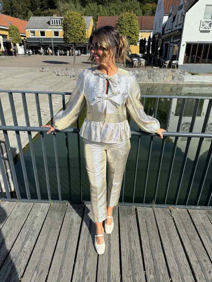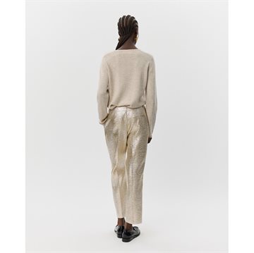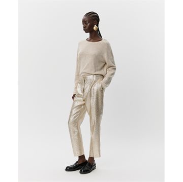SOFIE SCHNOOR CORDELIASW Trousers i light gold er et par elegante, skræddersyede bukser med metallic effekt og struktureret overflade, der giver et eksklusivt og stilfuldt look. Bukserne har straight legs med let cropped længde, pressede læg foran og praktiske lommer både foran og bagpå.