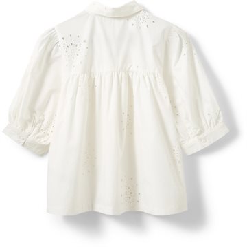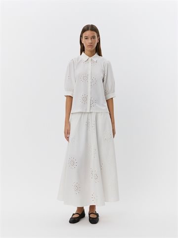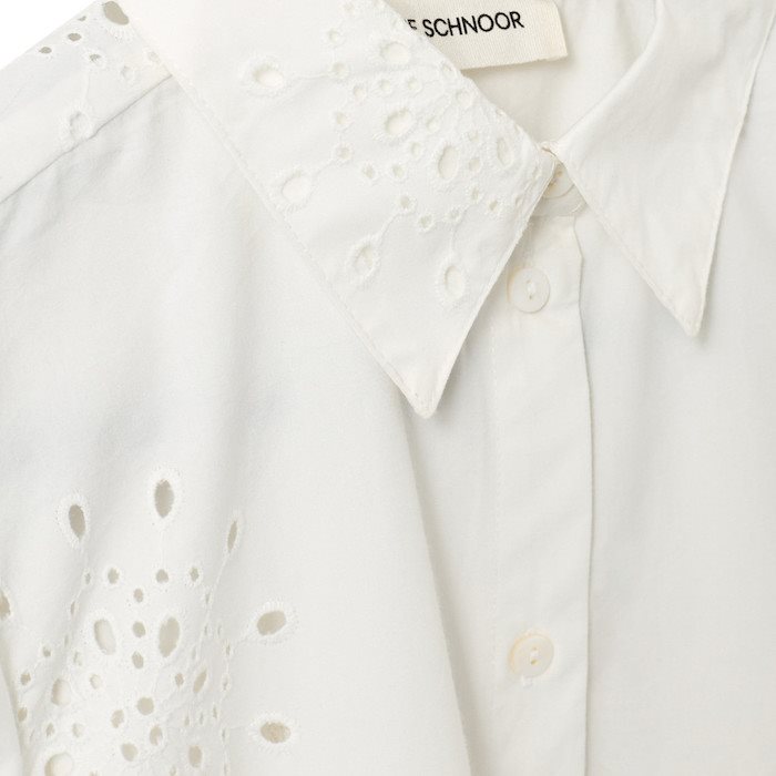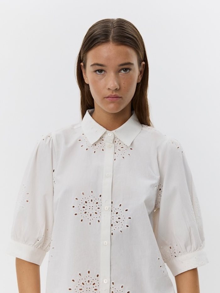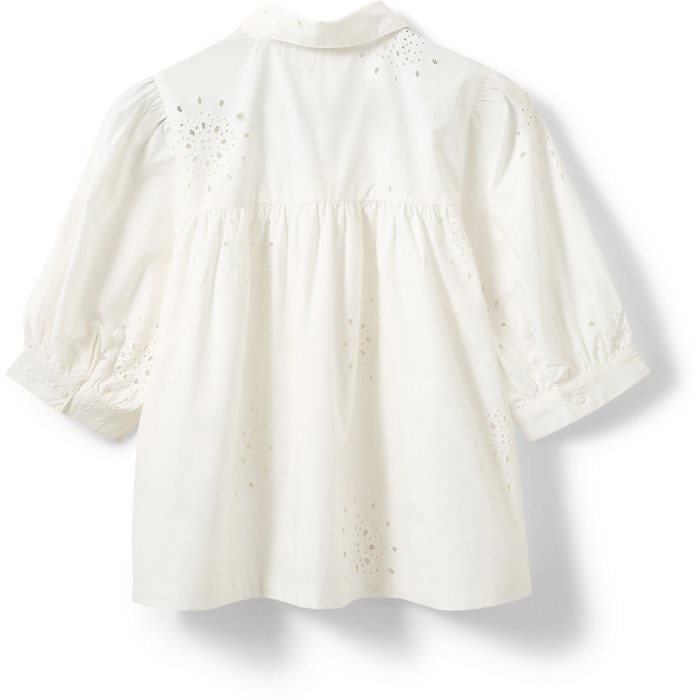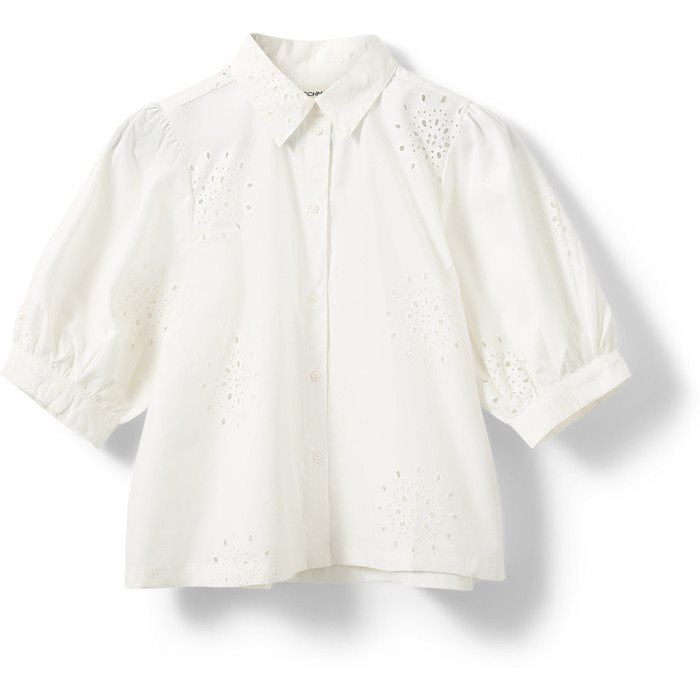 Denne elegante og enkle skjorte fra Sofie Schnoor er et feminint take på en klassisk hvid skjorte. Den har en løs pasform, puffede ærmer og et smukt broderet hulmønster, der tilføjer et romantisk udtryk. Knapper hele vejen ned giver mulighed for styling på flere måder – brug den lukket for et rent look eller åben over en top for et mere afslappet udtryk. Perfekt til både hverdag og sommerens lette lag-på-lag outfits.