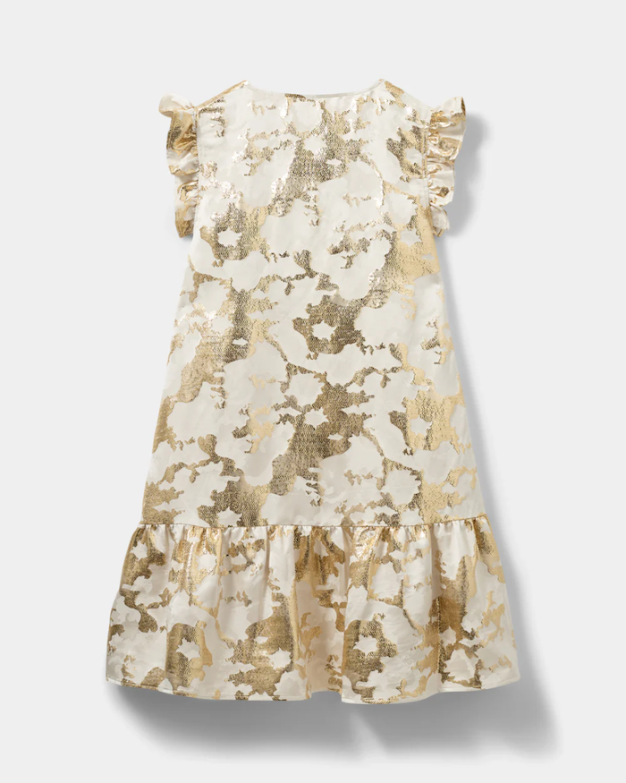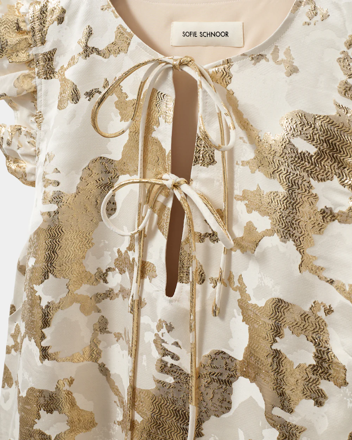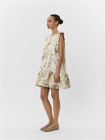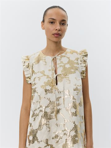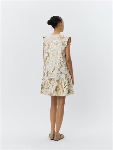 Feminin og elegant kjole i hvid med et smukt metallisk mønster, der fanger lyset på fineste vis. Kjolen har en flatterende V-udskæring, som lukkes med et dekorativt sløjfebånd i halsen. De korte flæseærmer og den løse pasform giver et let og luftigt udtryk – perfekt til varme dage.
