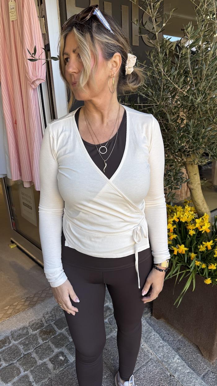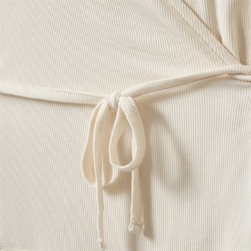 Elegant og feminin slå-om bluse fra Sofie Schnoor i en klassisk off white farve. Blusen er designet i et blødt og strækbart materiale med fin ribstruktur, som giver en smuk og flatterende pasform.