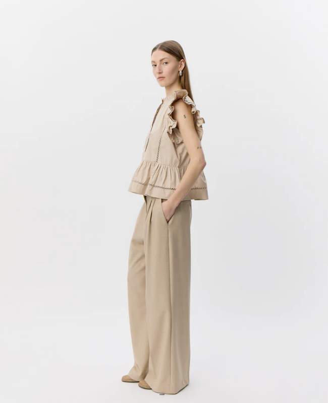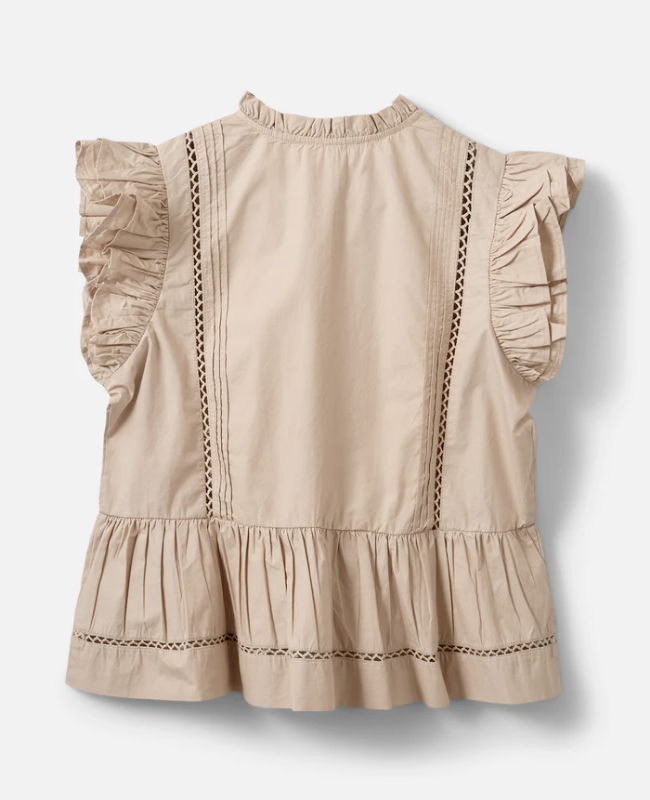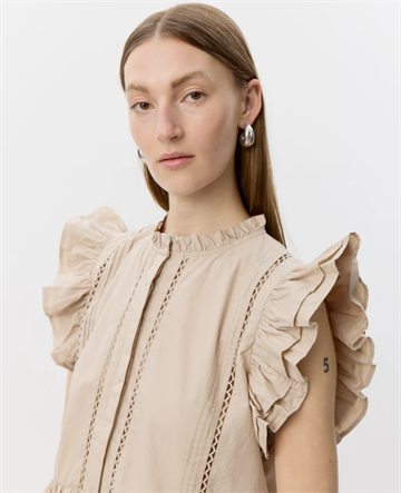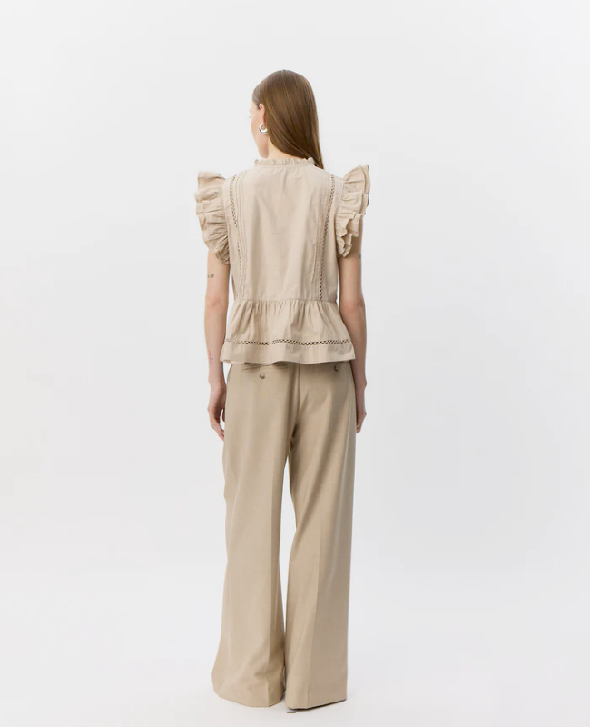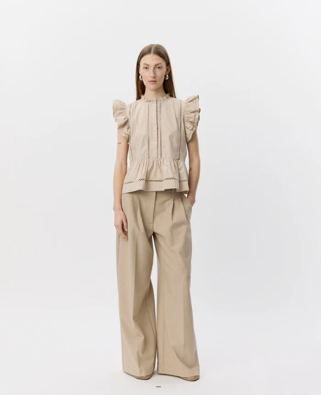 Toppen er designet med en elegant rund hals med flæsekrave, som giver et blødt og feminint look. De fine blondeindsatser tilfører et eksklusivt touch, mens de lette flæseærmer skaber bevægelse og elegance. Den løse pasform sikrer høj komfort og et afslappet, men stilfuldt udtryk.
