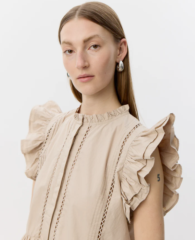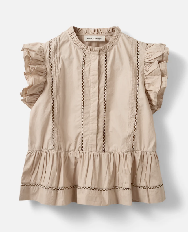 Feminin og let top fra Sofie Schnoor med fine detaljer og et romantisk udtryk. JULIENSW Frill Cotton Top er fremstillet i 100% let bomuld, som gør den åndbar og behagelig – perfekt til både hverdag og sommerlige anledninger.