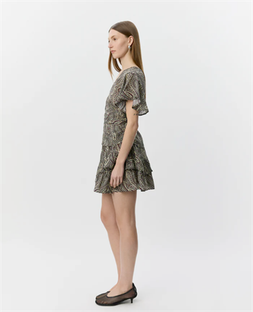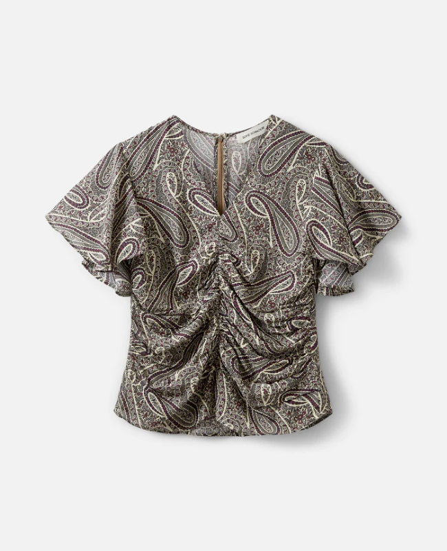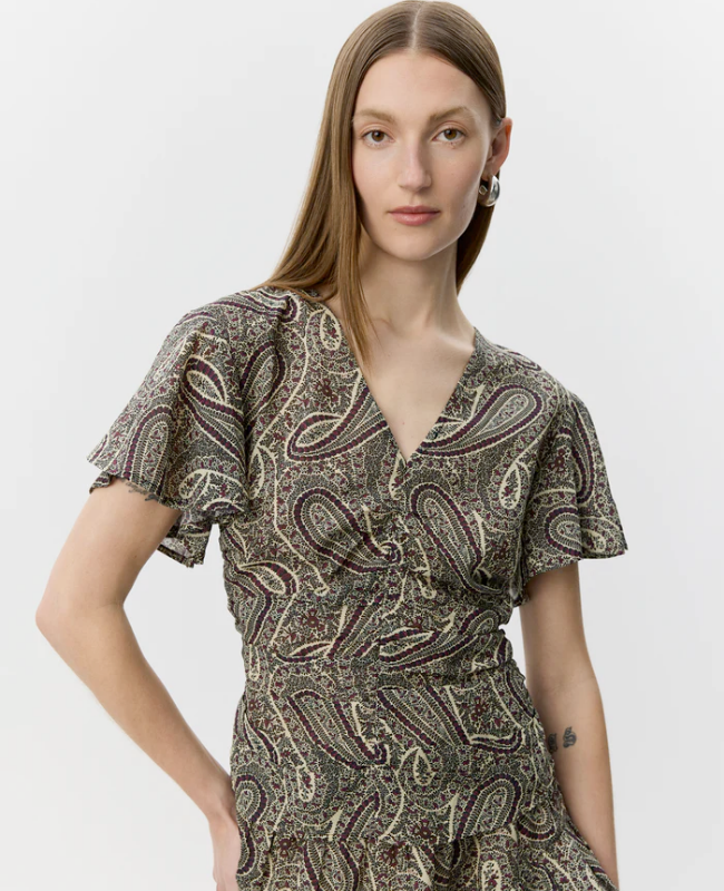 Blusen har en flatterende V-udskæring med fine rynkedetaljer foran, som giver et blødt og feminint fald. De korte, lette flæseærmer tilføjer bevægelse og elegance, mens den skjulte lynlås i ryggen sikrer en god pasform.