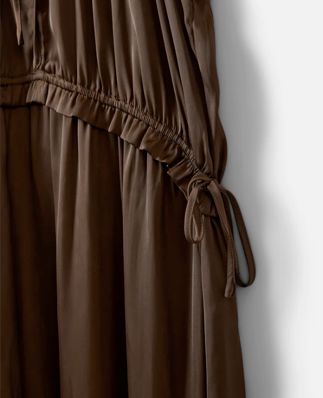 Kjolen har en markeret talje med justerbart bindebånd, som fremhæver figuren og sikrer en fleksibel pasform. Den dybe V-udskæring med flæsekrave og frontslids med knaplukning giver et feminint og elegant look, mens de bløde rynker omkring taljen skaber et flot fald.