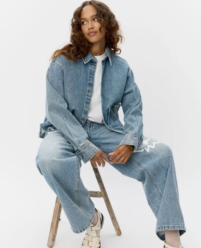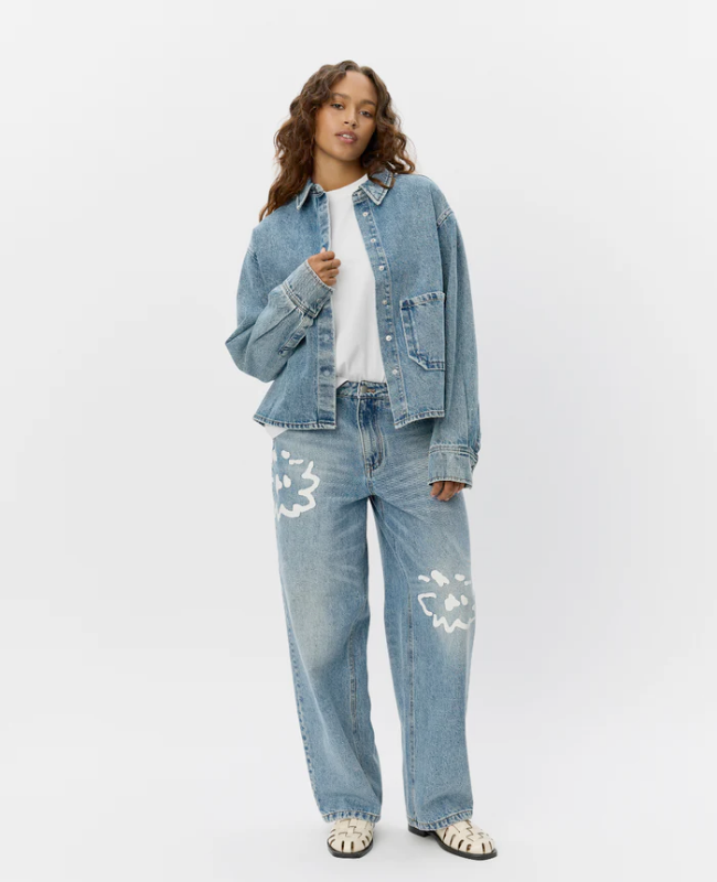 Den klassiske pasform gør jakken alsidig og nem at style – brug den over en kjole, til jeans for et fuldt denimlook eller som let overgangsjakke. Det fine print på ryggen tilfører et legende og charmerende twist til det rå denimudtryk.