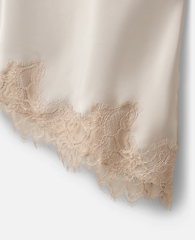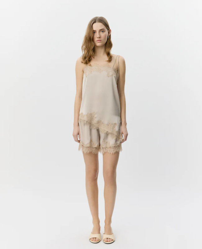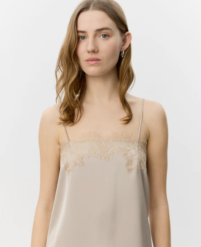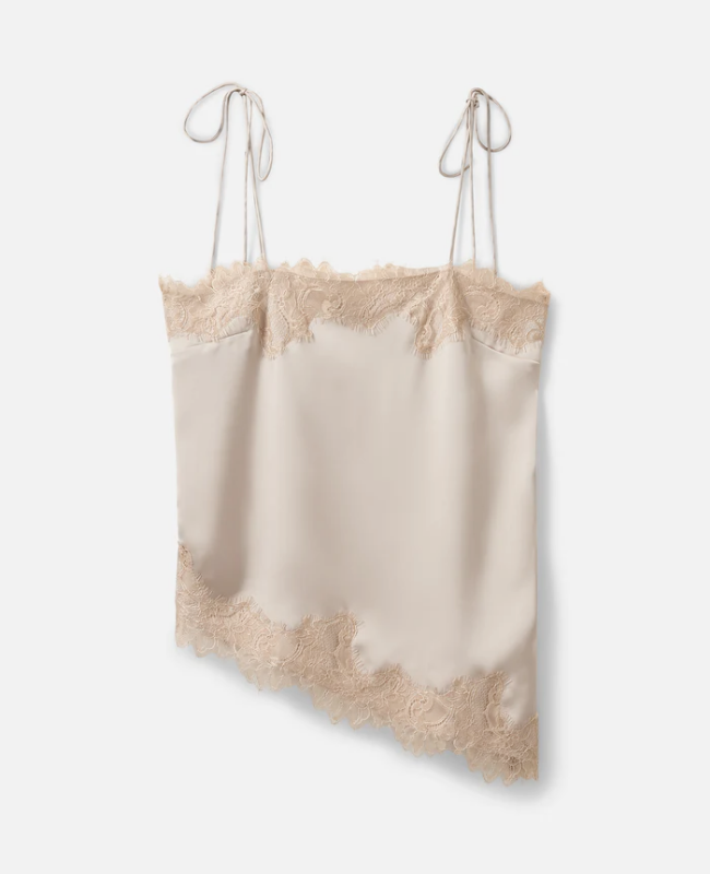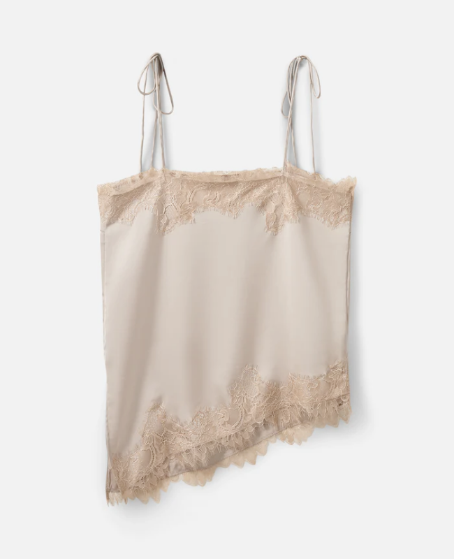 Toppen har fine justerbare bindebånd på skuldrene, så du nemt kan tilpasse pasformen. De delikate blondedetaljer tilfører et romantisk touch, mens den asymmetriske bund giver et trendy og unikt look.