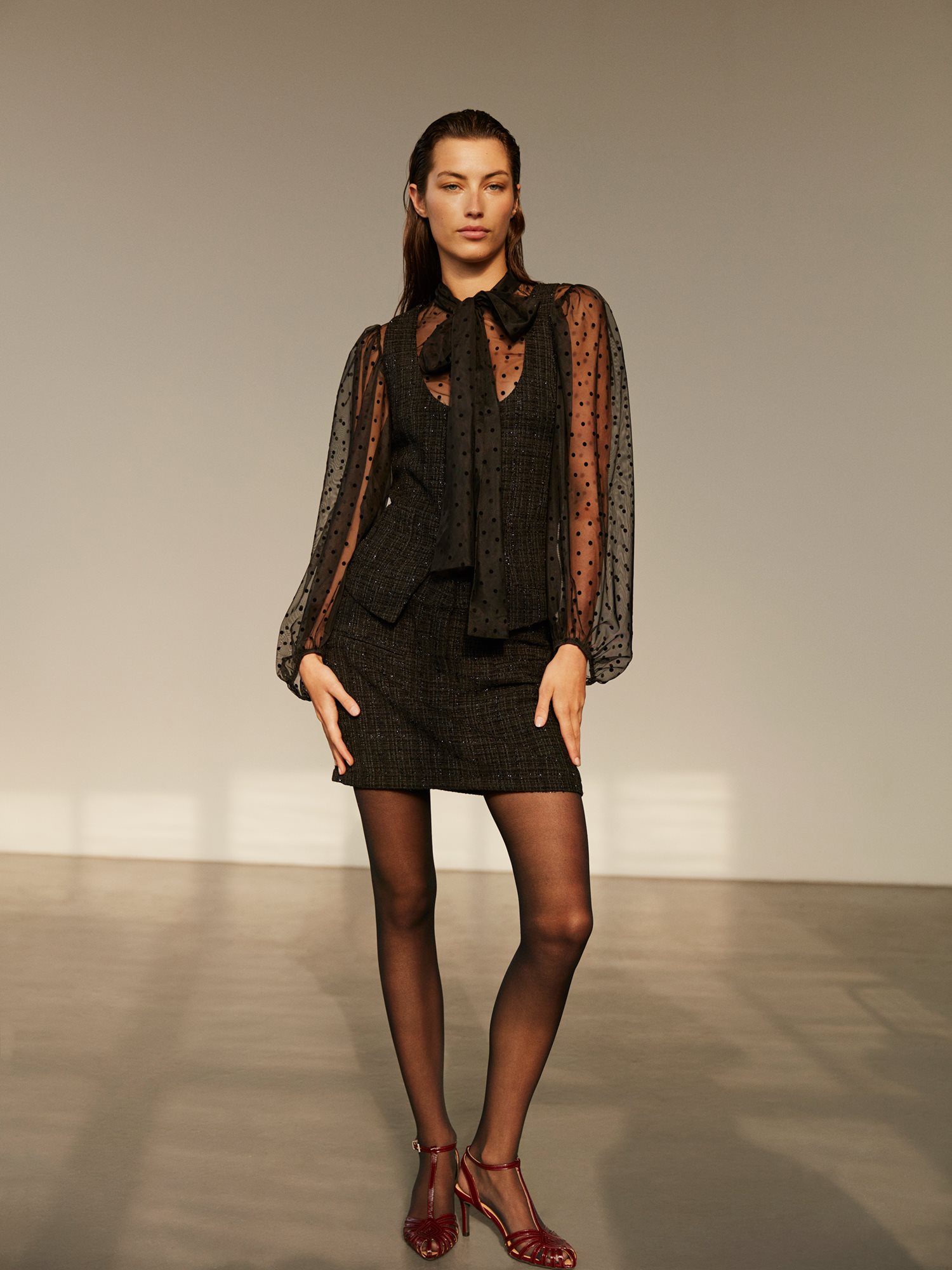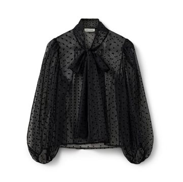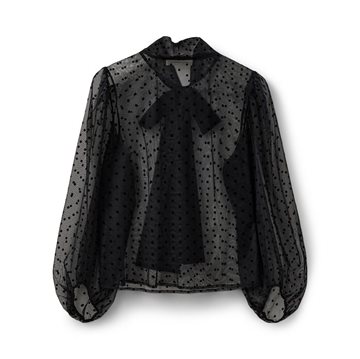 Den fineste Sofie Schnoor bluse emmer af elegance og lethed. Blusen er gennemsigtig med små sorte prikker og har smukke ballonærmer, der giver et feminint udtryk. Med et delikat bindebånd om halsen tilføjes der et ekstra sofistikeret touch. Bær den med en top indenunder for et stilfuldt lag-på-lag look – perfekt til både hverdag og festlige anledninger, hvor du ønsker et chic og elegant outfit!