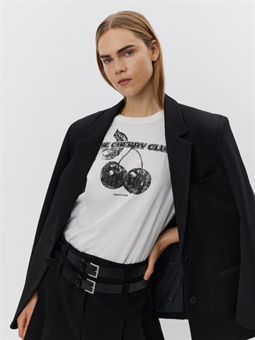 Gør din hverdagsstil både cool og afslappet med denne hvide kortærmede T-shirt fra Sofie Schnoor. T-shirten har en løs pasform, der giver en komfortabel og moderne silhuet, mens den cool skrift foran og det ikoniske kirsebærlogo tilføjer et trendy og unikt udtryk.