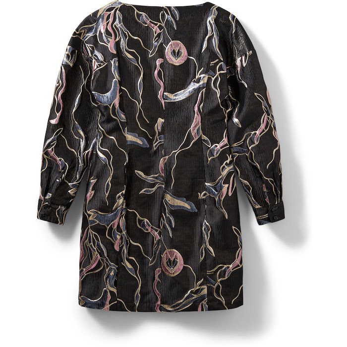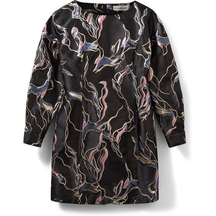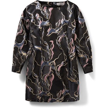 Designet fuldendes med en bred bådudskæring, lange ærmer med to knaplukninger og læg, samt skjult lynlås i ryggen. Den skinnende lurex-blanding gør kjolen ideel til festlige lejligheder, hvor du vil skille dig ud med et feminint og eksklusivt look.