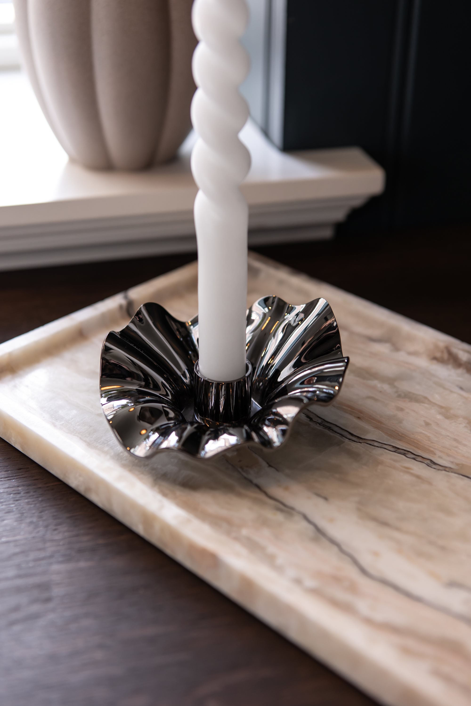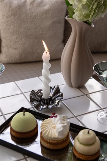 Den smukke mørke chrome farve tilføjer et luksuriøst præg til ethvert rum og passer perfekt ind i både moderne og klassiske indretninger. Lysestagens organiske former reflekterer lyset på smukkeste vis, hvilket skaber en hyggelig og stemningsfuld atmosfære.