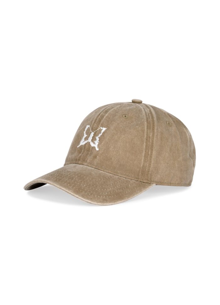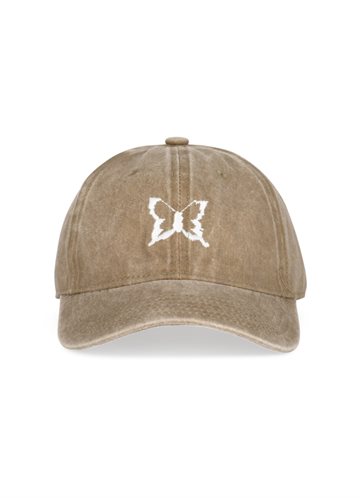 Sommerens accessories er landet. Denne lære kasket fra SUI AVA er i den lækreste khaki farve med forvaskede detaljer. Der er broderet en lille sommerfugl på kasketten som en eksta lille detalje.