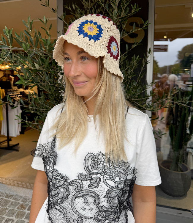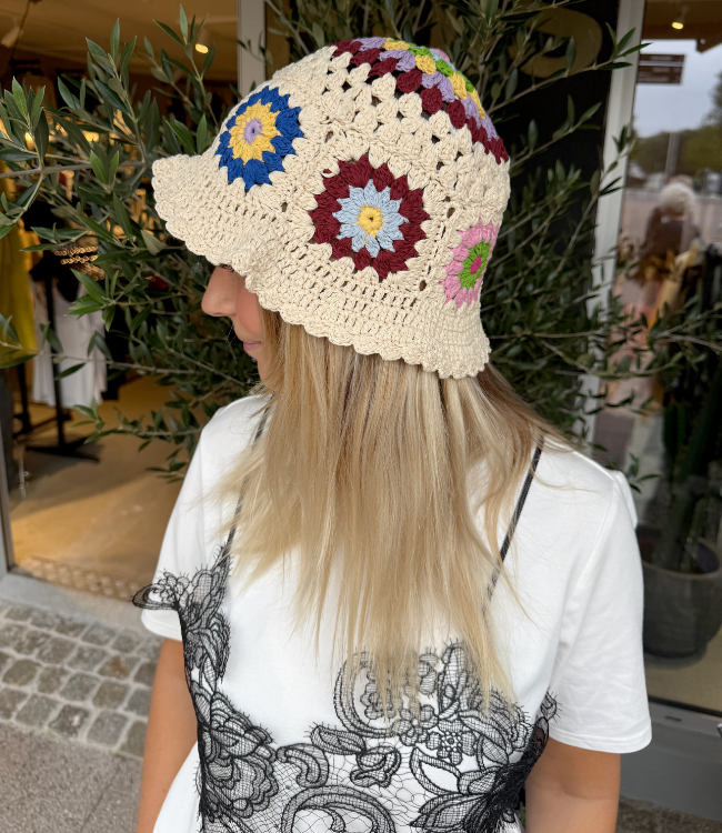 Giv dit outfit et kreativt og farverigt twist med denne unikke bøllehat fra Sui Ava. Hatten har et bohemeinspireret look med hæklede detaljer og farverige blomster, der emmer af sommerstemning og personlig stil. Perfekt til festivaler, stranddage eller som en statement accessory i hverdagen.