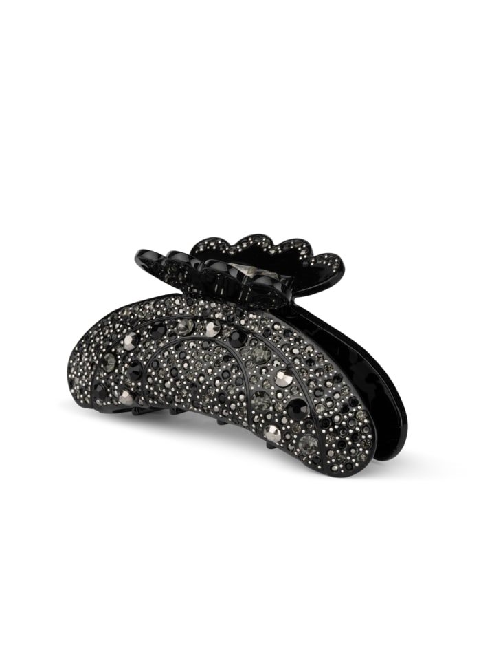 Denne mellemstore hårklemme har en klassisk sort farve og er pyntet med funklende rhinestones, som skaber et elegant og stilfuldt udtryk.