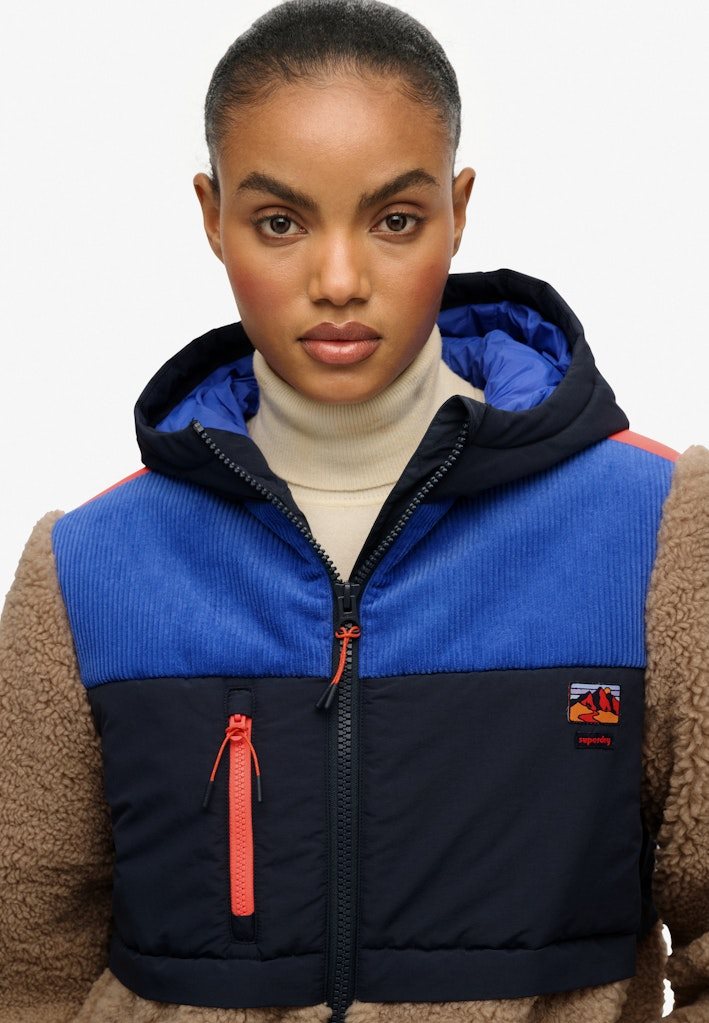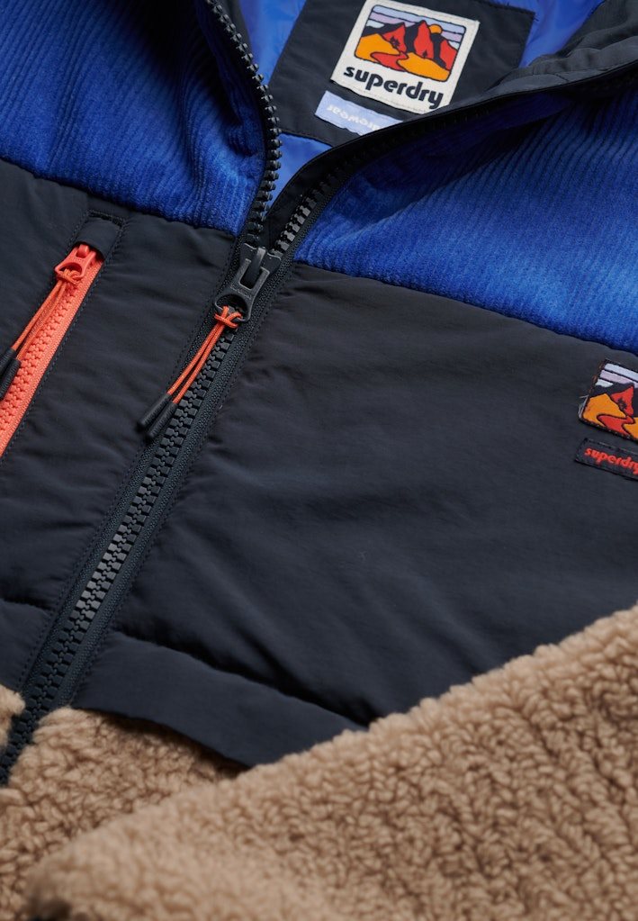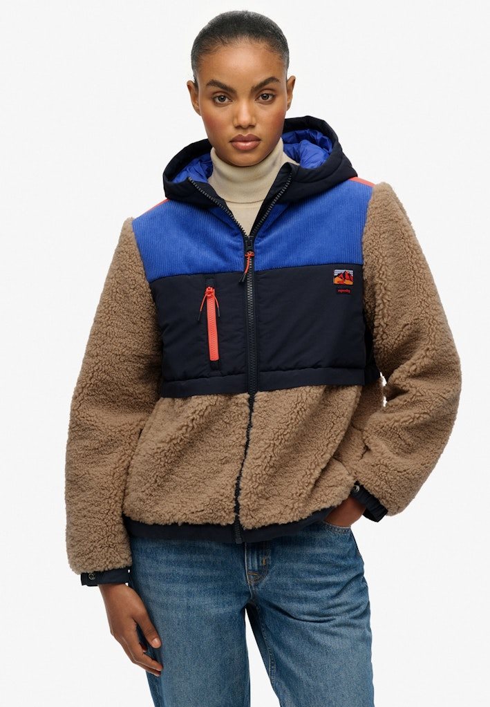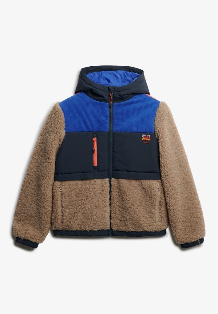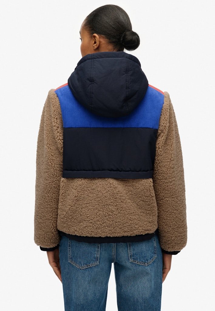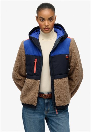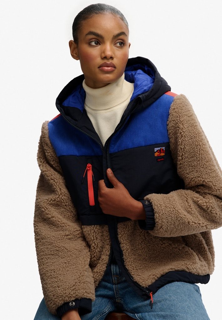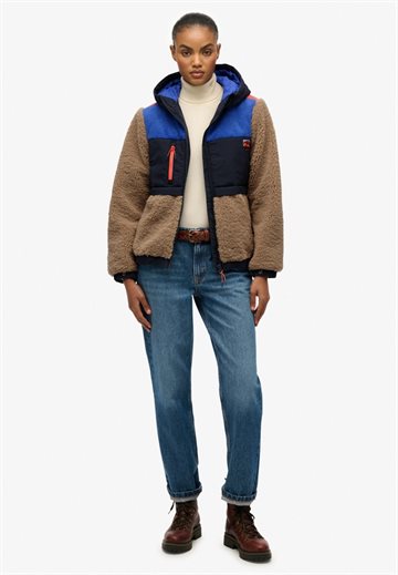 Den er fremstillet i et blødt sherpa-materiale med kontrastpaneler, der giver et moderne og dynamisk look. Jakken har hætte, gennemgående lynlås, tre praktiske udvendige lynlåslommer samt justerbar elastik i kanten for et individuelt fit. Ærmerne har trykknapjustering, og det ikoniske Superdry-logo pryder brystet.