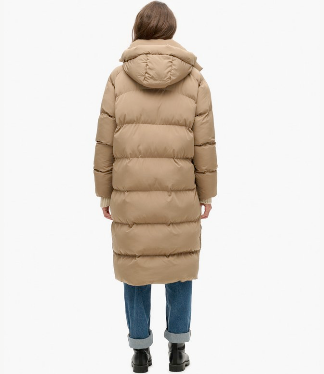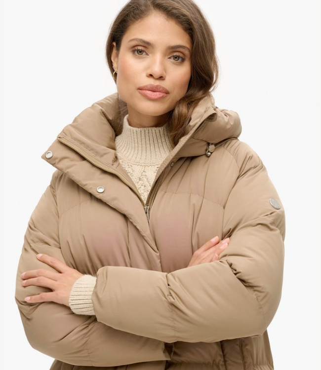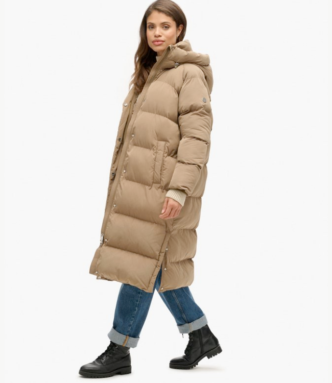 Bring komfort og stil tilbage til garderoben med denne lange dynejakke fra Superdry i farven Fossil Brown. Jakken har en urban og oversized pasform, der giver et moderne og afslappet udtryk – perfekt til de kolde måneder.