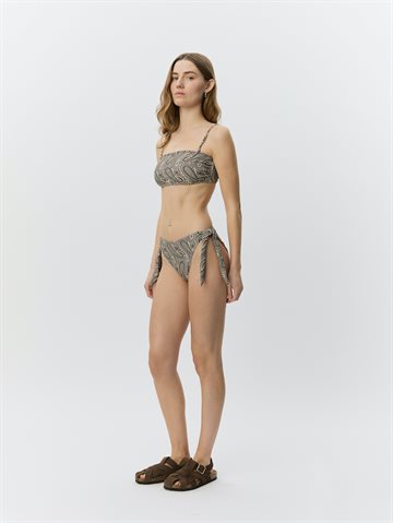 Bikinien består af en bandeau top med aftagelige stropper, så du kan tilpasse looket alt efter stil og behov. Den indbyggede silikonekant sikrer, at toppen bliver siddende, mens den aftagelige padding giver fleksibilitet og komfort.