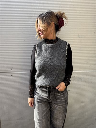 Denne smukke strikvest har et moderne og feminint udtryk med fine perlebesætninger langs ærmegabene, der tilføjer et eksklusivt touch til den klassiske strikstil.