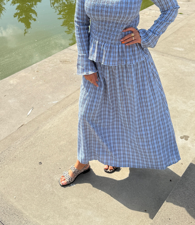 Fuldend dit look med den Marie nederdel fra Vero Moda, der matcher den elegante Marie top. Nederdelen er designet i et let crepet stof med et smukt ternet mønster i blå og brune nuancer, som skaber et sofistikeret og moderne udtryk.
