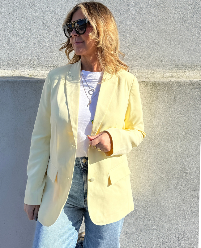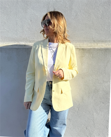 Skab et stilrent og moderne look med denne elegante pastelgule blazer fra Vila. Blazeren har et klassisk snit med lange ærmer, reverskrave og to knapper foran, som giver et tidløst og sofistikeret udtryk. Den friske pastelgule farve tilfører et let og feminint touch til din garderobe og er perfekt til både hverdag, arbejde og festlige anledninger.