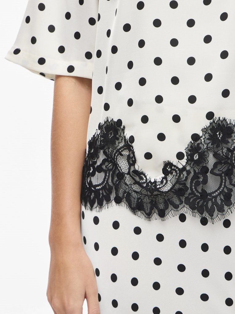 Toppen er designet med rund hals og 2/4-ærmer, hvilket skaber en flatterende og alsidig silhuet. Den gennemgående knaplukning tilfører et klassisk touch, mens blondedetaljerne giver et feminint og eksklusivt præg. Det sorte prikprint på den lyse Birch bund skaber en stilren kontrast, som gør toppen nem at style til både hverdag og fest.